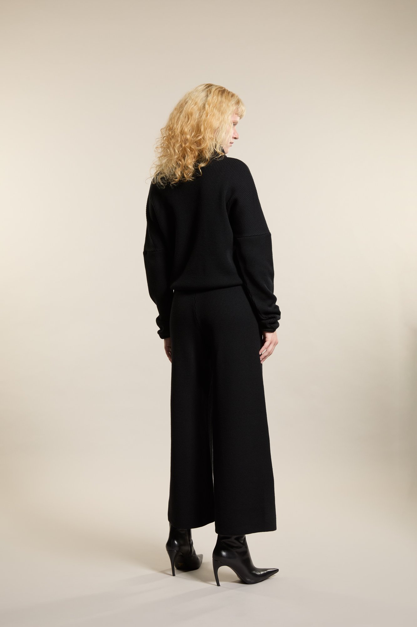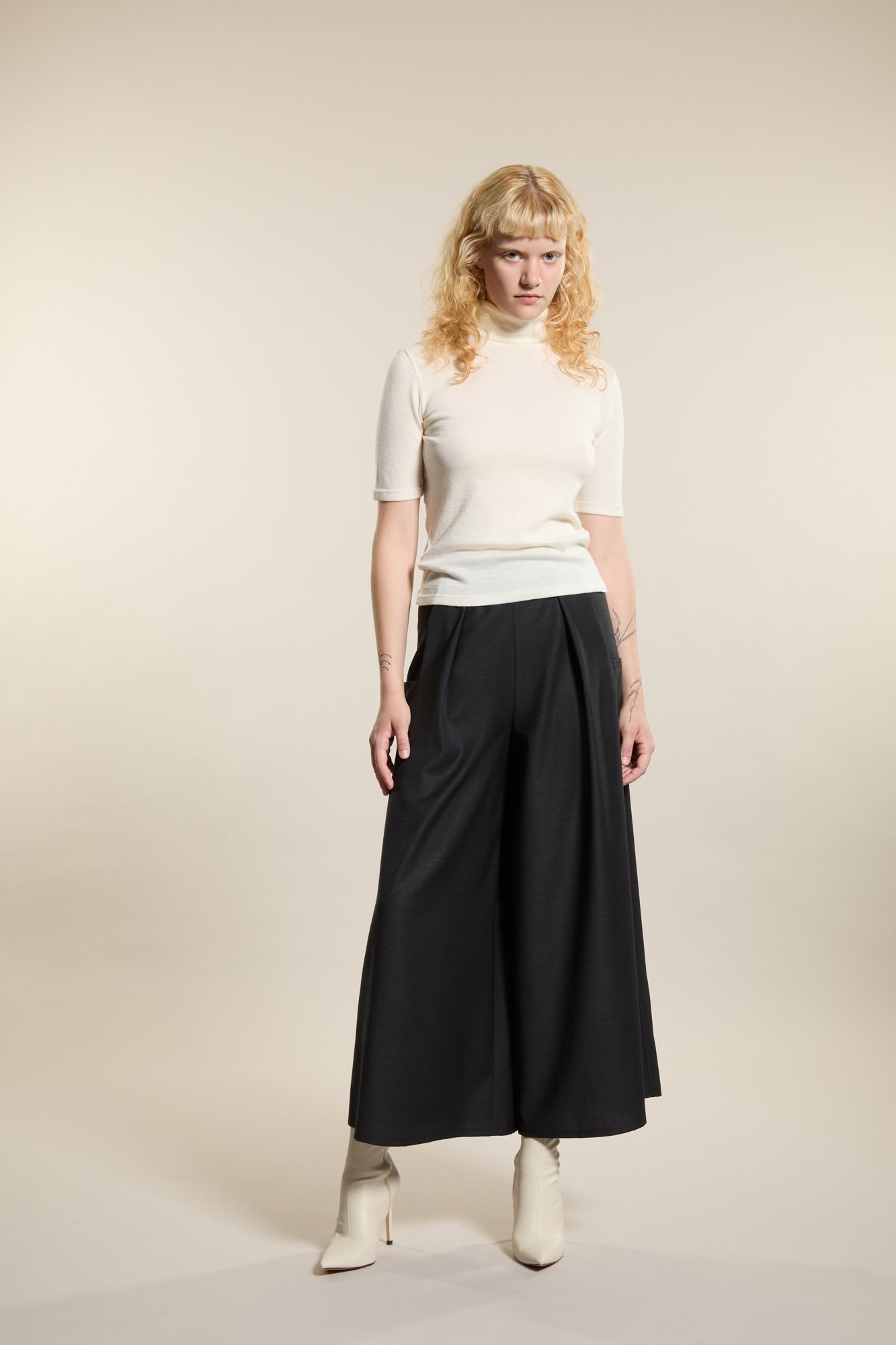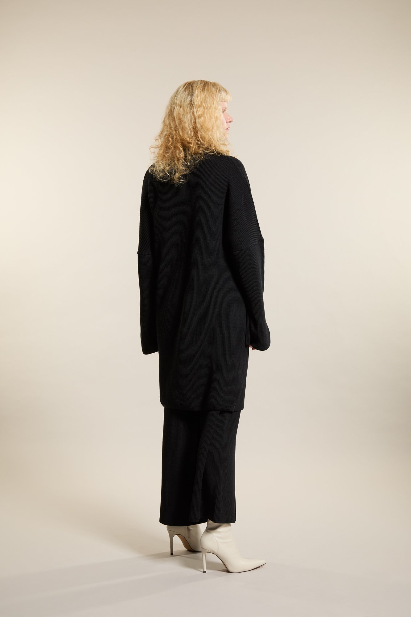The collection plays with the combination of soft, natural colors and clean lines. The anthracite-colored knit trousers and sweaters made from soft, luxurious merino wool not only offer unparalleled comfort but also create an elegant foundation for any outfit. Their architectural structure and minimalist cut lend them a modern, purist character.