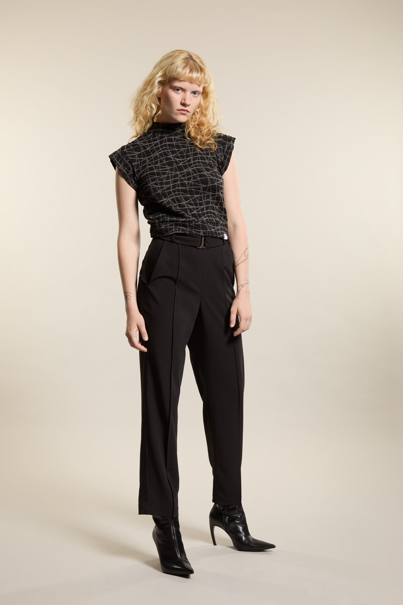 For the fashion-conscious who want to be a little more daring, there are tops and culottes made of stretchy fabric, decorated with geometric patterns that give the collection an artistic and strong expression. These pieces combine comfort with a striking, graphic statement and represent the creative evolution of form and function.