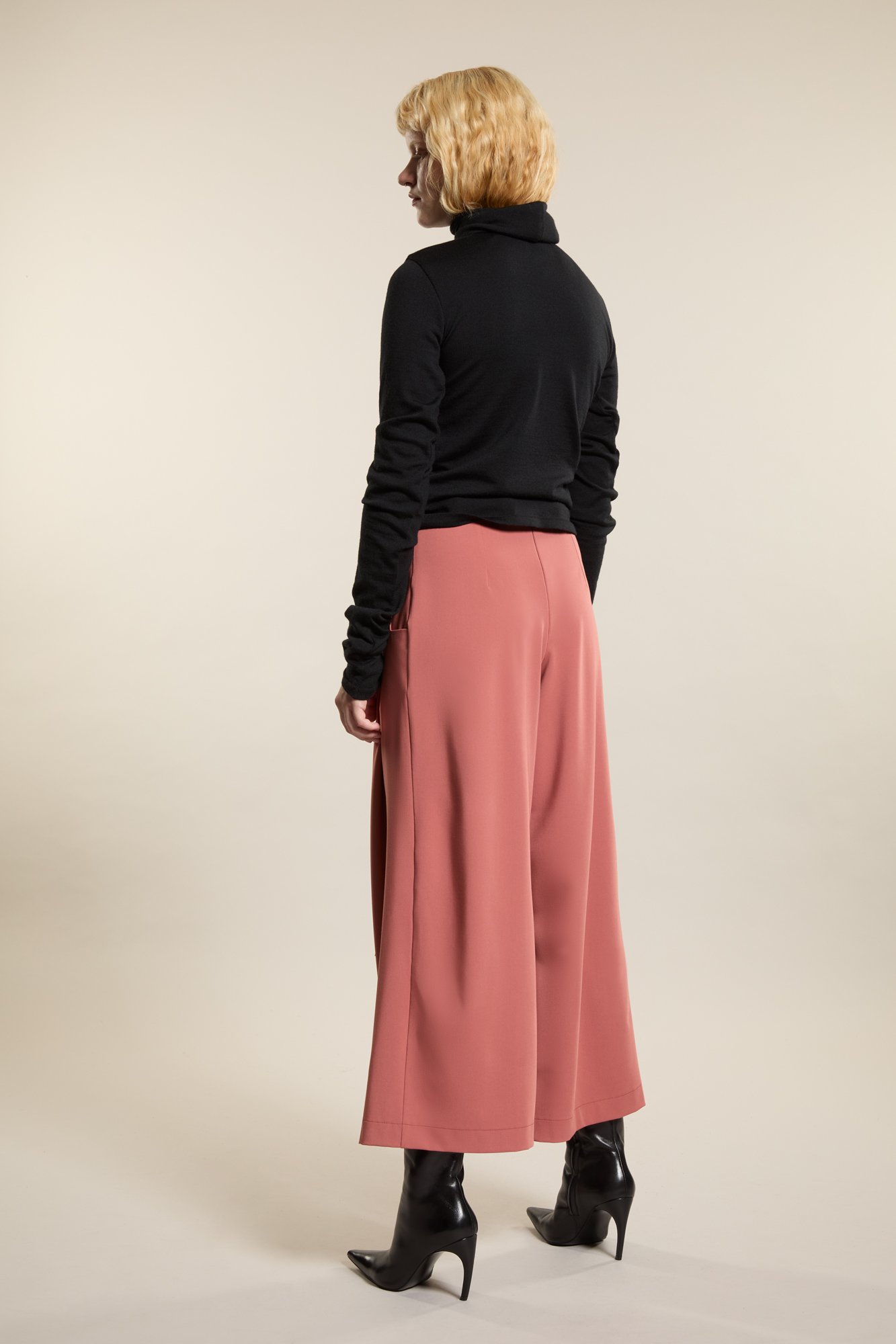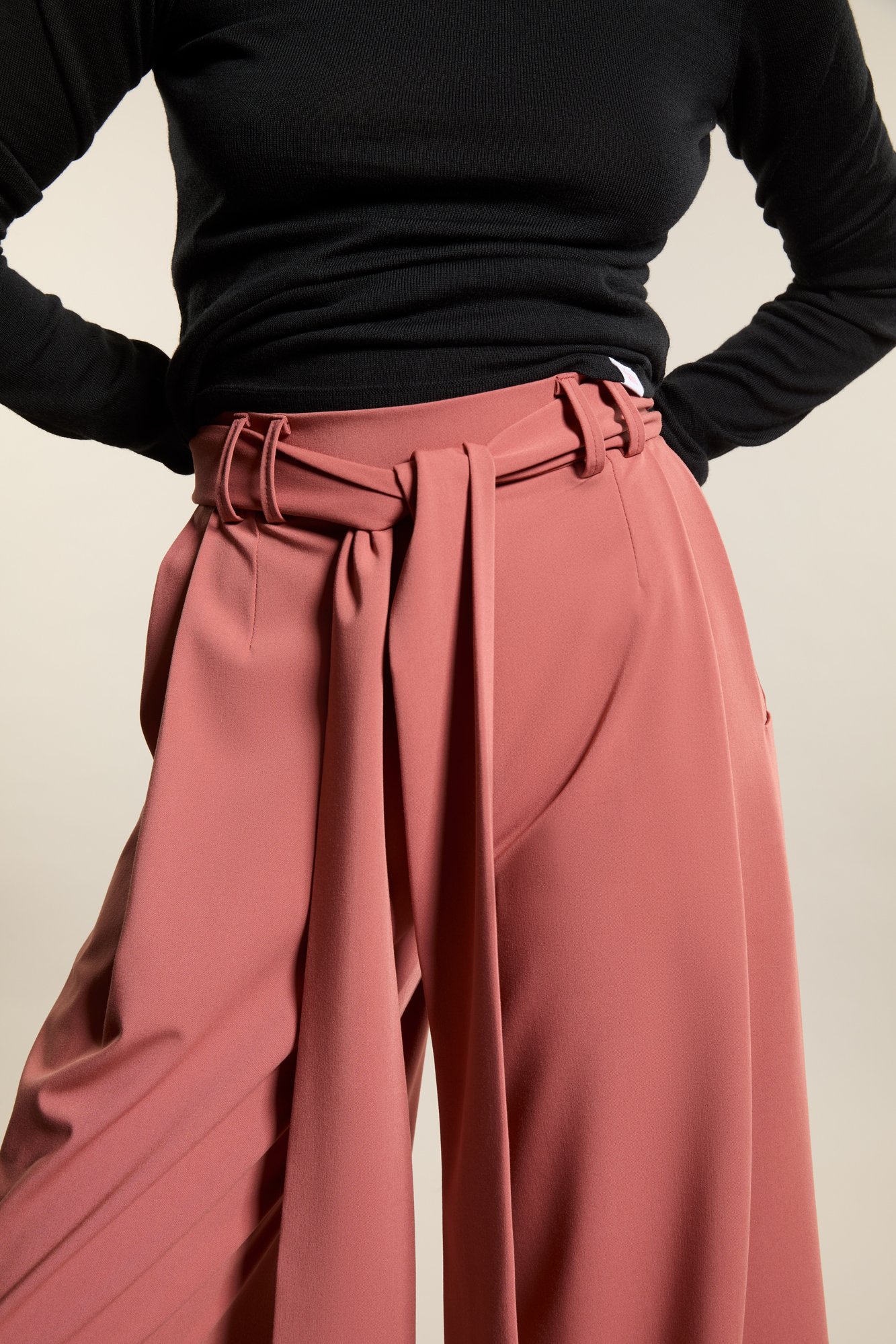 The collection is complemented by wide-cut trousers and blouses in salmon-colored tones, which reflect the spiritual approach of harmony and balance in fashion. Their clean lines and fine details add sophisticated accents.